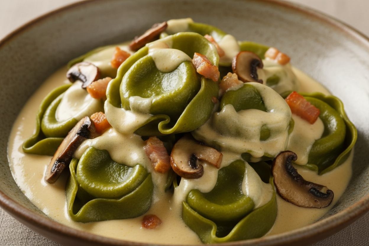 Our green Balanzoni, stuffed with the Bolognese tradition (ricotta and mortadella), enhanced by a velvety Parmesan sauce, fresh seasonal porcini mushrooms, and an irresistible touch of crispy guanciale