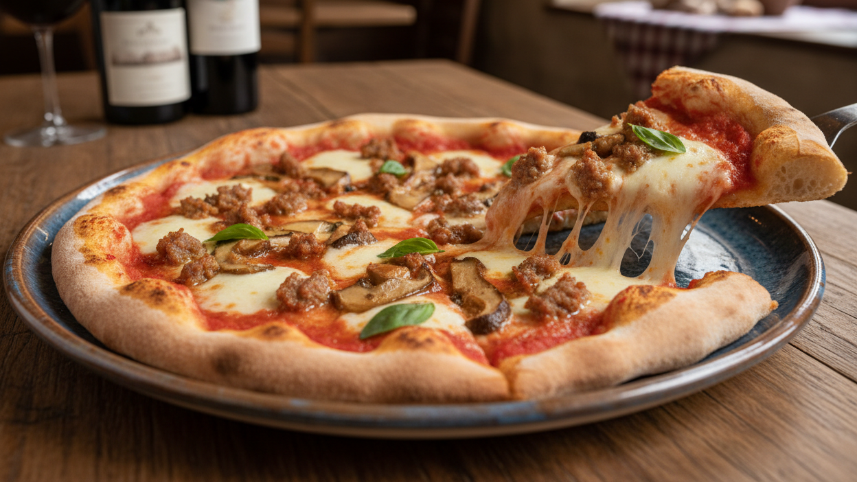 Tomato sauce, Mozzarella, Italian Sausage and Porcini Mushroom