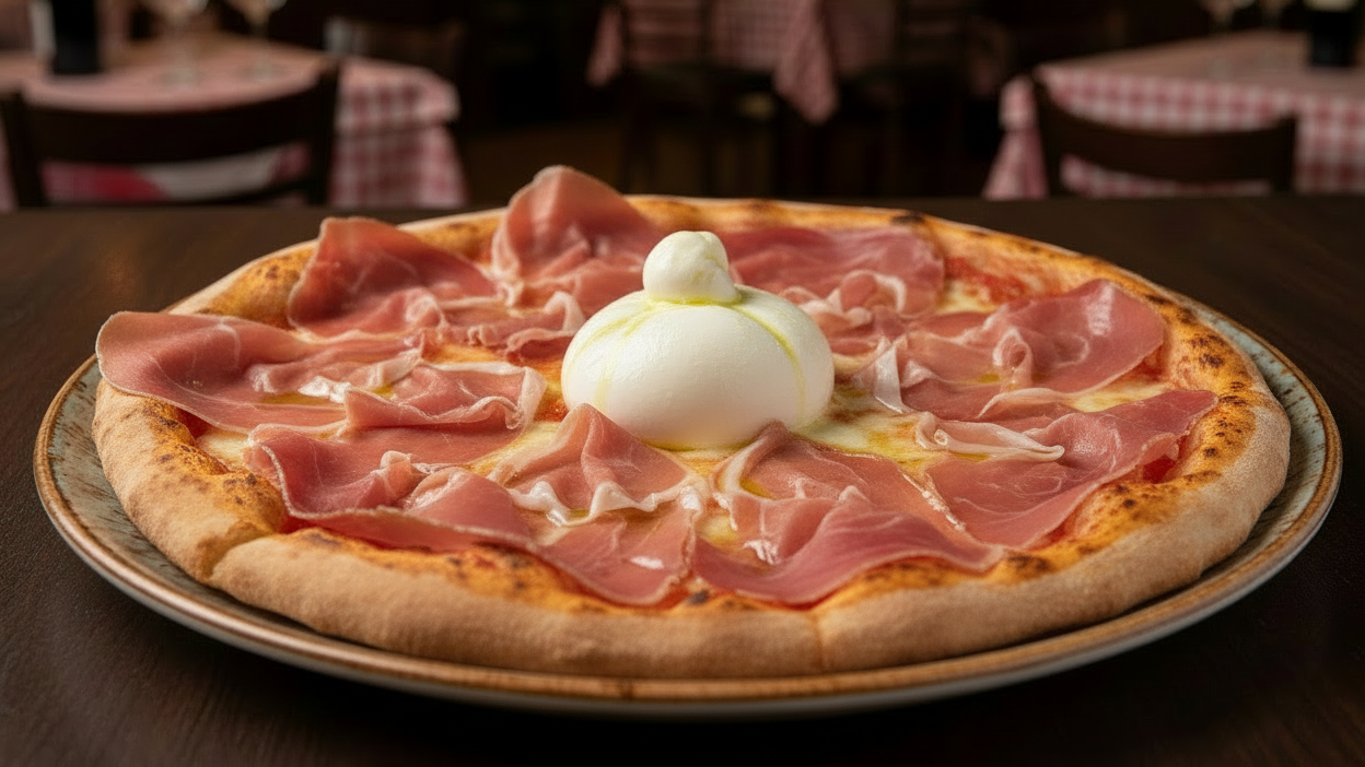 Tomato sauce, Mozzarella, San Daniele Ham, burrata and Cherry Tomatoes