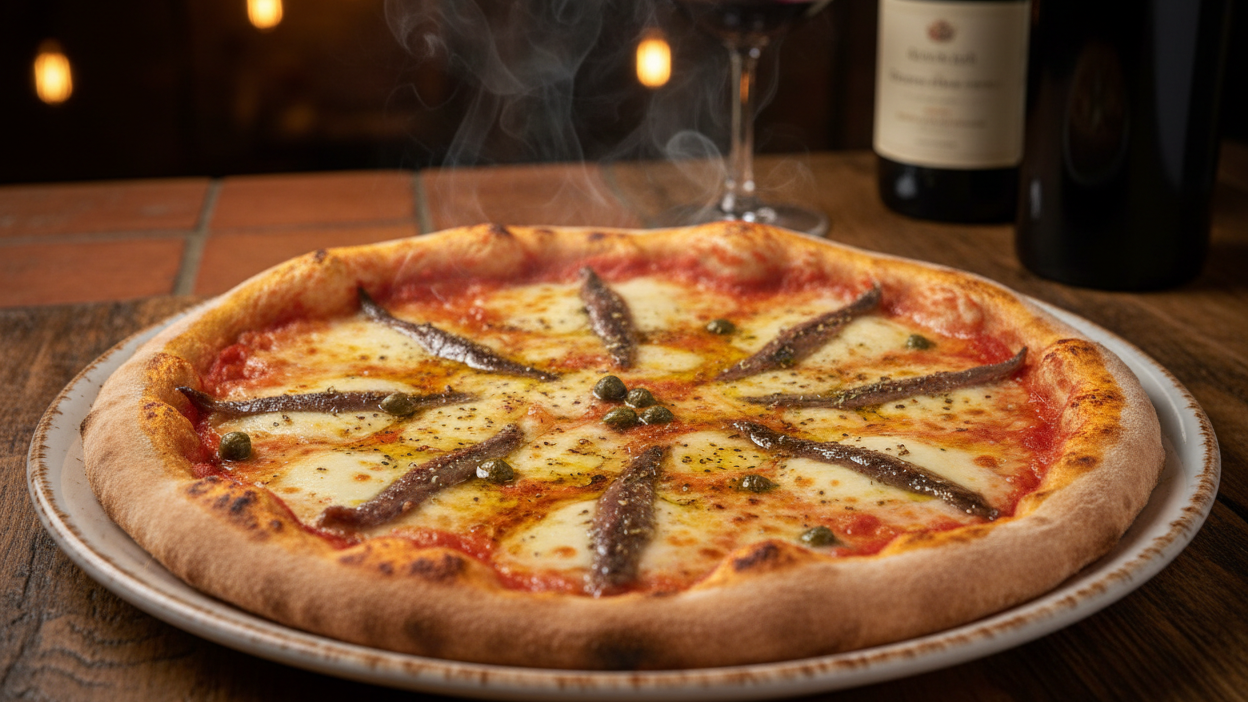 Tomato sauce, Mozzarella cheese, cappers and anchovies