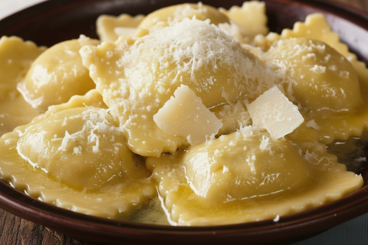 Handmade ravioli filled with ricotta, spinach, and parmesan cheese. Enjoy a taste of Italy Emilan Tradition with every bite of our Homemade Ravioli alla Parmigiana. Made with fresh ingredients and a traditional recipe, these flavorful pasta pockets are sure to satisfy your cravings. Buon appetito!